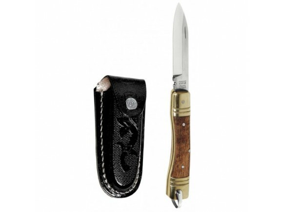 Canivete CIMO em aço inox cabomadeira c/ bainha- 210/3 C/B- Canivete estilo Francês, acabamento latão maciço e o melhor das madeiras de lei Brasileiras, uma leve curva no cabo que garante uma boa empunhadura,lâmina em inox 420,ponta com corte acentuado.Acompanha bainha de couro.