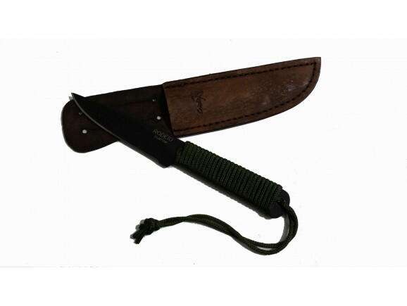 Faca de Mato feito com aço carbono, com pintura epóxi, a qual protege da oxidação, cabo encabado com cordão. Acompanha bainha em couro.