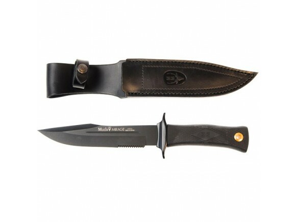 Faca tática Muela com cabo de Zamak preto emborrachado e orifício para alça. Guarda- mão duplo e Revestimento PTFE na lâmina, parcialmente serrilhada no gume. Acompanha bainha de couro preto.