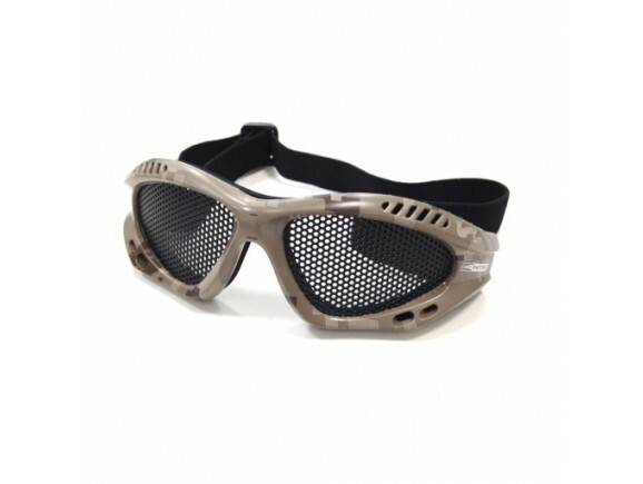 Óculos de proteção NTK modelo Kobra. Trata-se de um óculos telado, confeccionado em arame de metal, que não embaça, altamente resistente a qualquer arma de airsoft. É totalmente respirável permitindo que o ar flua. Possui bordas da armação cobertas por polietileno, material flexível e confortável. Passante de cabeça em borracha para ajuste de tamanho.